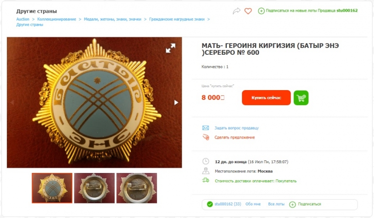 Орус интернет сайттарында Кыргыз өлкөсүндө көп балалуу энелерге ыйгарыла турган “Баатыр эне” ордени баштапкы баасы 8 миң рубль менен сатыкка коюлду.