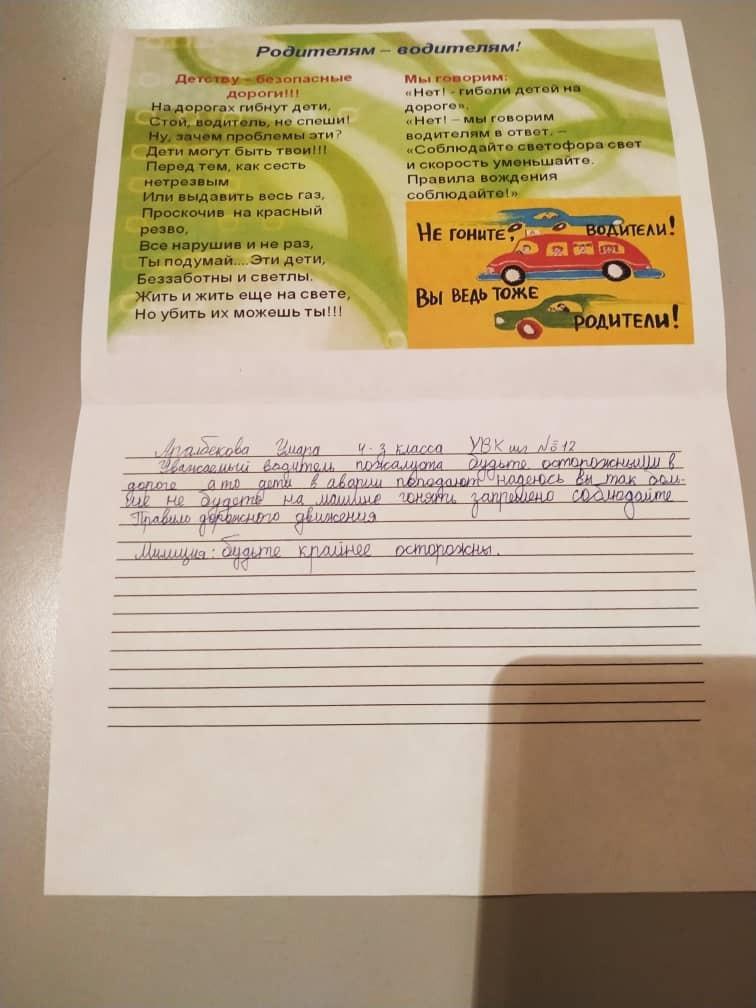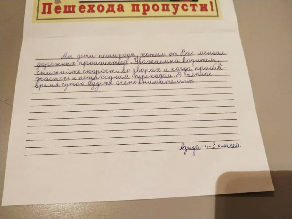 "Урматтуу айдоочу! Жол кыймылынын эрежелерин сактагыла. Эгер айдоочулар дагы, жөө жүрүүчүлөр дагы эрежени сактаса, жол кырсыктары болмок эмес. Унааны башкарып бара жатканда, кол телефон менен сүйлөшпөгүлө. Дөнгөлөктөрүңөрдү сөзсүз түрдө кышкысына алмаштыргыла. Жүргүнчүлөргө орой мамиле жасабагыла, анткени орой сөзгө орой жооп аласыңар. Жашоо бирөө эле. Өзүңөрдүн жана башкалардын өмүрүн сактай жүрөлү", - деп жазылат Амина аттуу кыздын катында.
